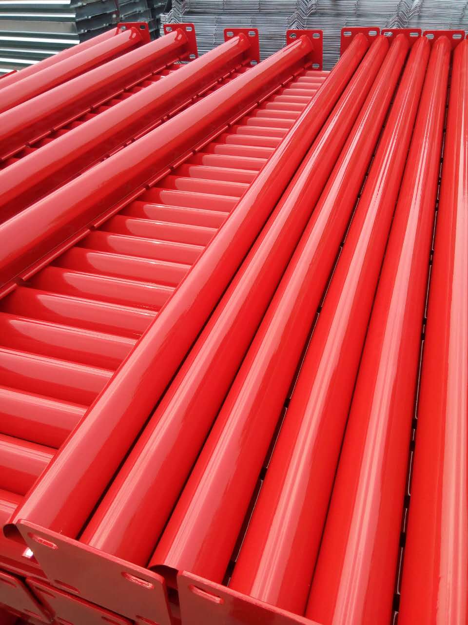 3. 靜電噴涂階段:將打砂完的護欄網及其立柱配件掛起放入流水線機器上,依次通過水洗槽、脫脂槽、水洗槽、磷化槽,最后經過噴槍槽,樹脂粉末均勻的附著在護欄網及其立柱配件上,然后高溫加熱使粉末熔融,形成致密的塑層保護膜。